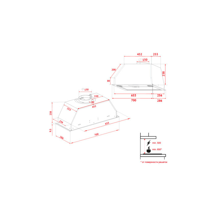 Подібний тип витяжок був розроблений спеціально, щоб зменшити візуальне навантаження в інтер'єрі та заощадити корисний простір. Вбудовуваний прилад монтується в нижню частину кухонного гарнітура таким чином, що панель керування розташовується паралельно до варильної поверхні. Витяжка виготовлена із фарбованого металу чорного кольору. При виборі агрегату, що вбудовується, слід враховувати розмір навісних шаф на кухні, які повинні відповідати ширині витяжки.