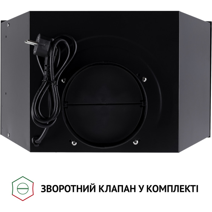 Керувати моделлю – зручно та легко. На передній панелі розташовується електронне управління, де знаходяться кнопки перемикання швидкостей роботи витяжки, увімкнення освітлення та вимкнення приладу.