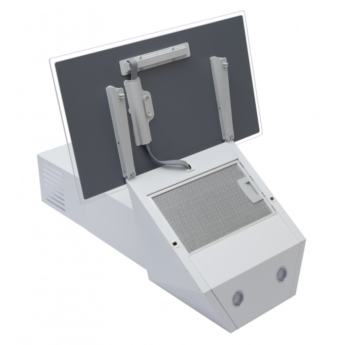 Лицьова частина витяжки виконана із загартованого скла та декорована прозорим обідком.