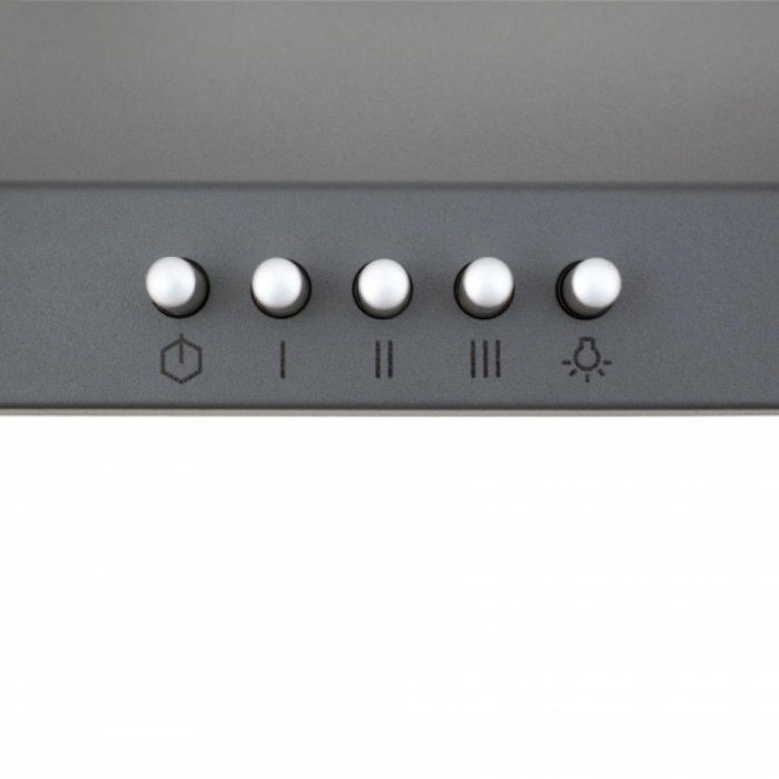 На передній панелі розташовується механічне кнопкове управління, де знаходяться клавіші перемикання швидкостей роботи витяжки, включення освітлення і виключення приладу.