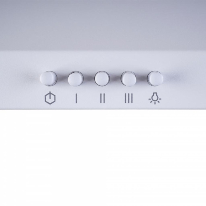 На передній панелі розташовується механічне кнопкове управління, де знаходяться клавіші перемикання швидкостей роботи витяжки, включення освітлення і виключення приладу.