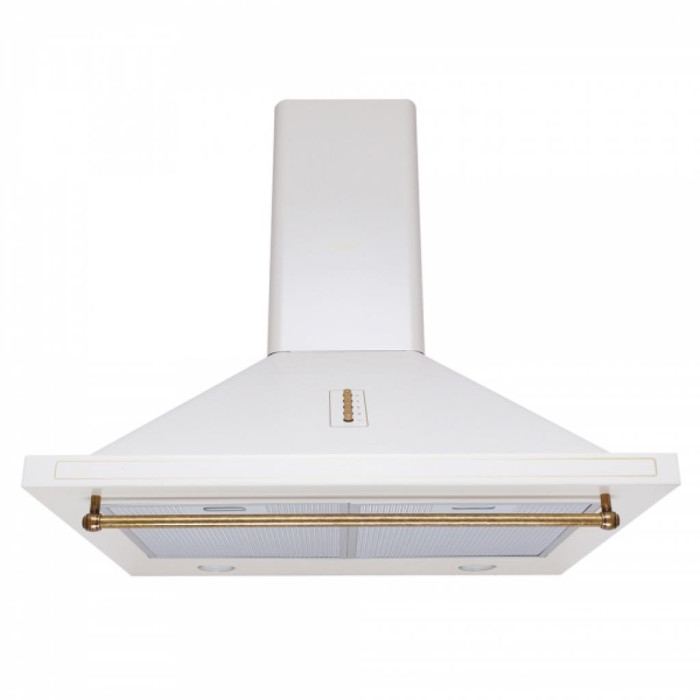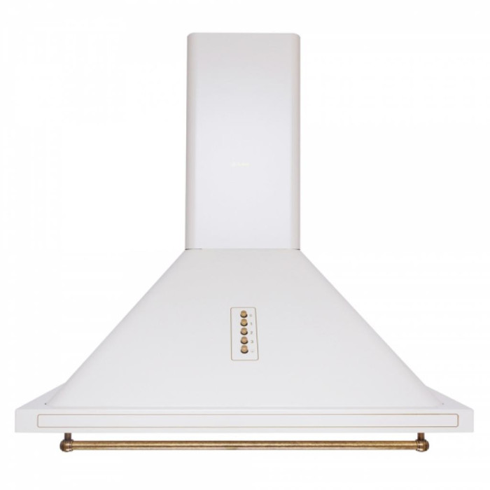 Декоративна купольна витяжка Perfelli K 6332 Retro LED ідеально доповнить інтер'єр, виконаний в італійському, середземноморському, античному стилі за рахунок присутності декоративного рейлинга і золотий серіографії, яка обрамляє декоративну металеву панель приладу, а також його механічну панель управління.