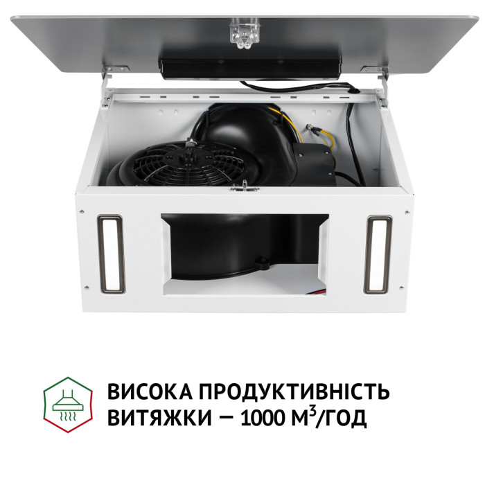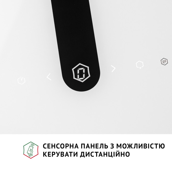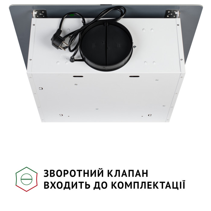 Керувати витяжкою зручно та легко! На фронтальній панелі вгорі розташоване сенсорне керування з символами увімкнення/вимкнення мотора та освітлення, а також перемикання швидкостей.