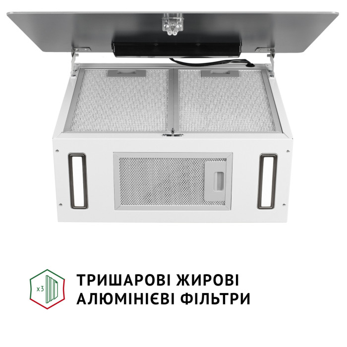 Витяжка обладнана двома тришаровими алюмінієвими фільтрами, що ефективно захищають двигун та інші деталі пристрою від забруднення жиром та випарами.