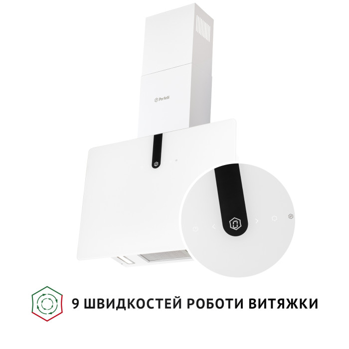 Кухонна витяжка Perfelli PIANO BIANCA має діапазон у дев'ять швидкостей з плавним переходом між ними. Це дозволяє найбільш точно обирати потрібну інтенсивність очищення повітря, залежно від його забрудненості.