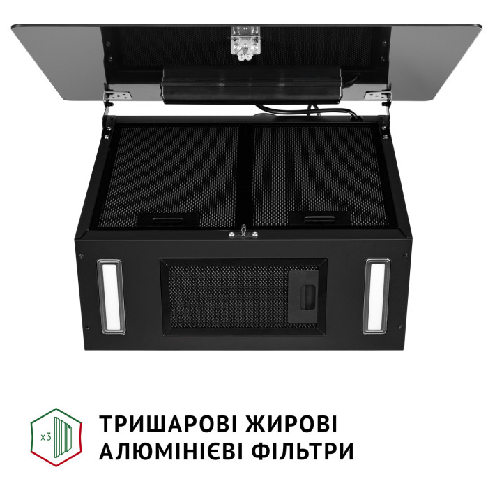 Витяжка обладнана двома тришаровими алюмінієвими фільтрами, що ефективно захищають двигун та інші деталі пристрою від забруднення жиром та випарами.