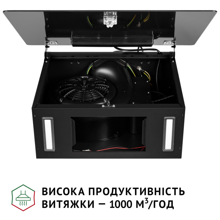 Декоративна похила панель з надміцного загартованого скла чорного кольору має чудові візуальні якості, тому з цією витяжкою ваша кухня виглядатиме ще сучасніше. У кухонному інтер'єрі дана модель може стати центральним елементом дизайну, так і додатковим, створюючи гармонійний простір. Його високо оцінять любителі сучасних стилів, таких, наприклад, як хай-тек та авангард.