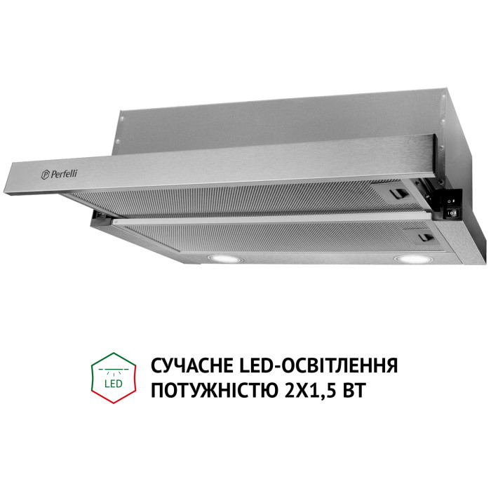 Телескопічна кухонна витяжка Perfelli TL 5212 I 700 LED має ергономічні властивості, тому дозволяє раціонально використовувати простір у зоні над варильною поверхнею. Конфігурація моделі включає: