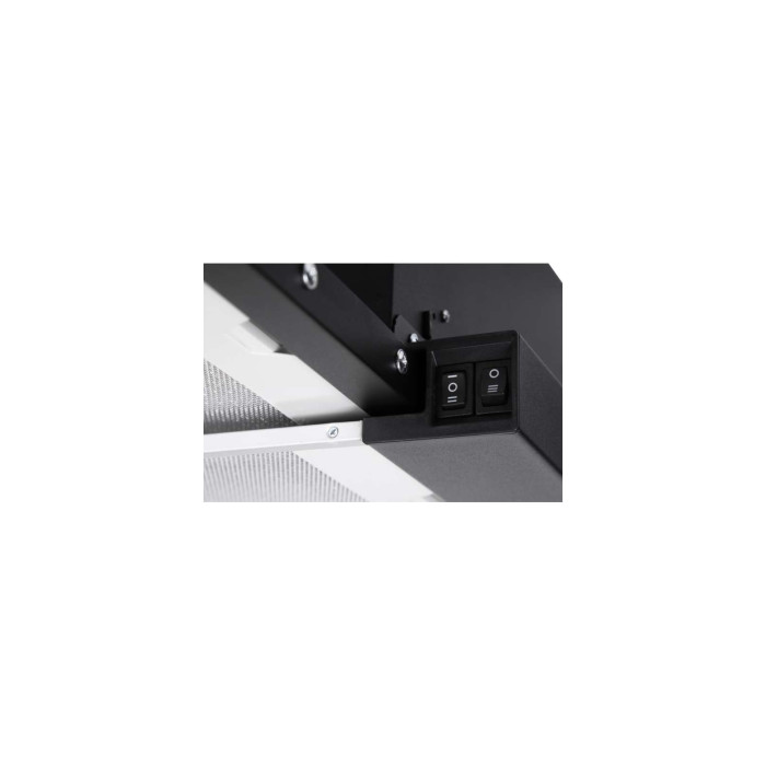 Дана витяжка має нейтральний дизайн, який не має особливих яскравих акцентів - все пристосовано для акуратної і непомітної інтеграції. Кнопковий блок також не виділяється на загальному тлі - він прихований висувною частиною пристрою. Кожна з кнопок має кілька положень, в яких її можна зафіксувати. Такий тип управління максимально простий і дасть вам можливість гранично швидко освоїтися з витяжкою.