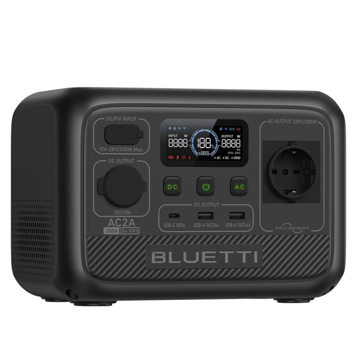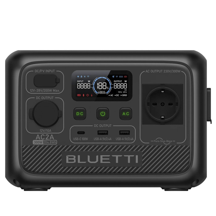 BLUETTI AC2A Portable Power Station, з ємністю 204,8 Вт·год, неперервною вихідною потужністю 300 Вт і максимальною потужністю до 600 Вт, важить лише 3,6 кг. Це ідеальний вибір для кемпінгу, автоподорожей, відпочинку на природі та інших подібних ситуацій.