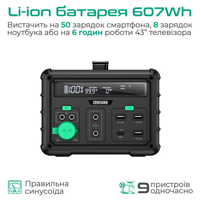 - Li-ion батарея на 607 Wh: Вистачить на 50 зарядок смартфона, 8 зарядок ноутбука або на 6 годин роботи 43” телевізора.